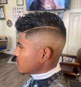 Haircut of your choice. Followed with straight razor on sideburns and neck. Combed and styled with product.(optional)