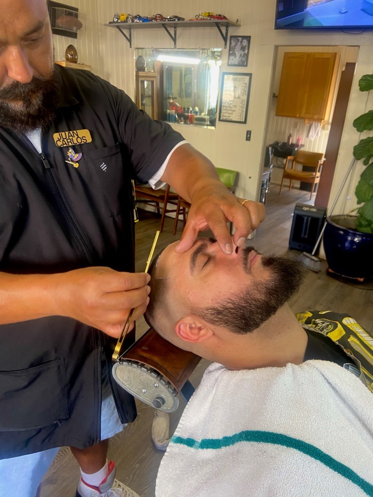You will be laid back in the barber chair with a steamed towel on your face and followed with a hot lather straight-razor shave. After, you will be rejuvenated with a splash of Bay Rum or Lemon Mint aftershave